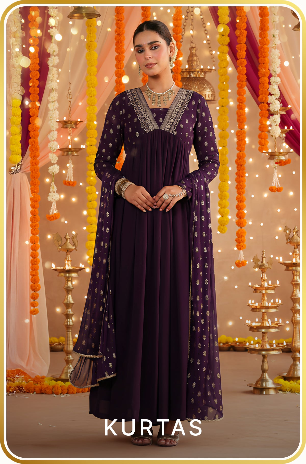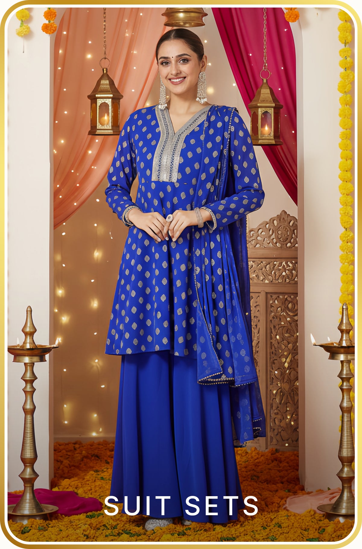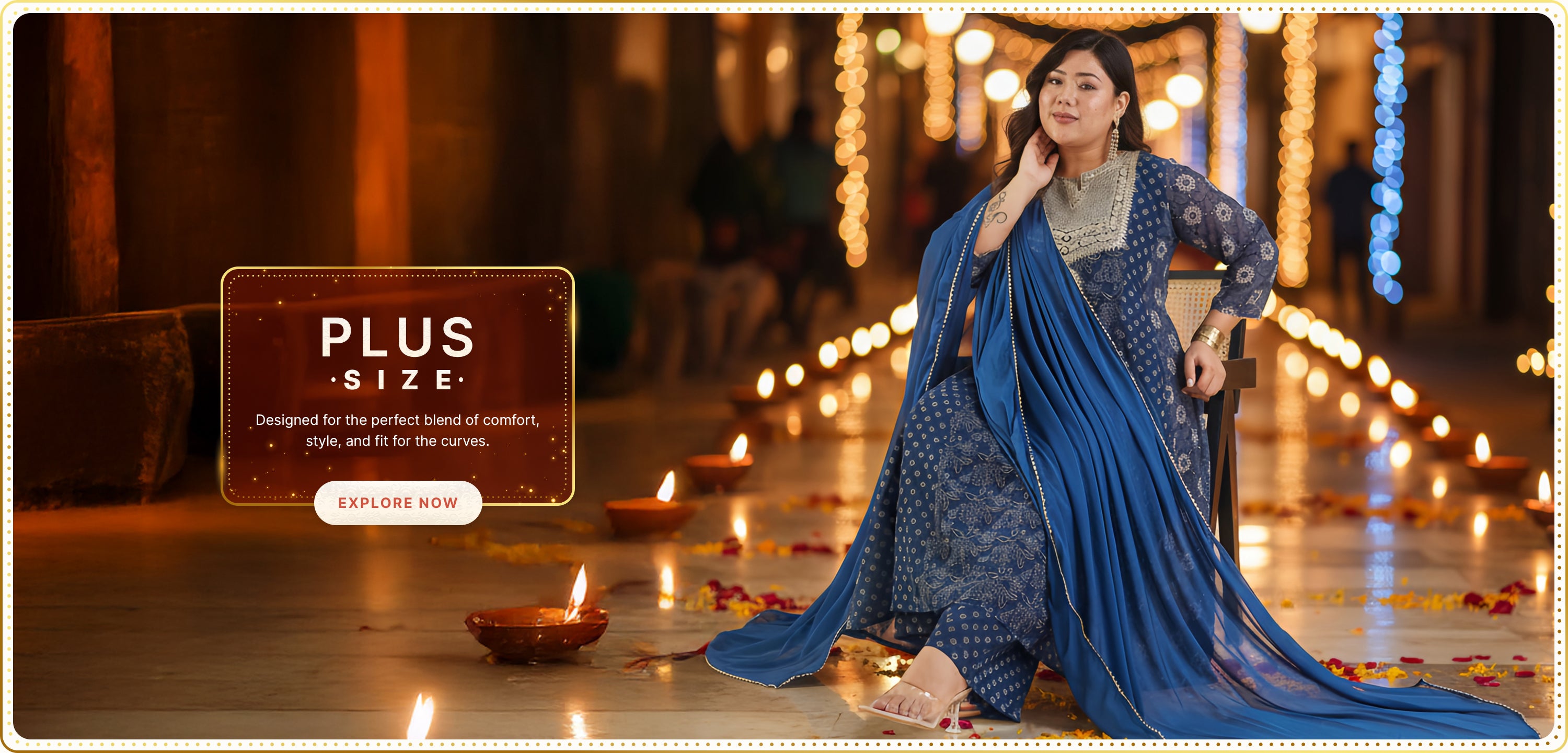 Janasya Women's Plus Size Dark Blue Georgette Ajrakh Printed Embellished Anarkali Kurta Set