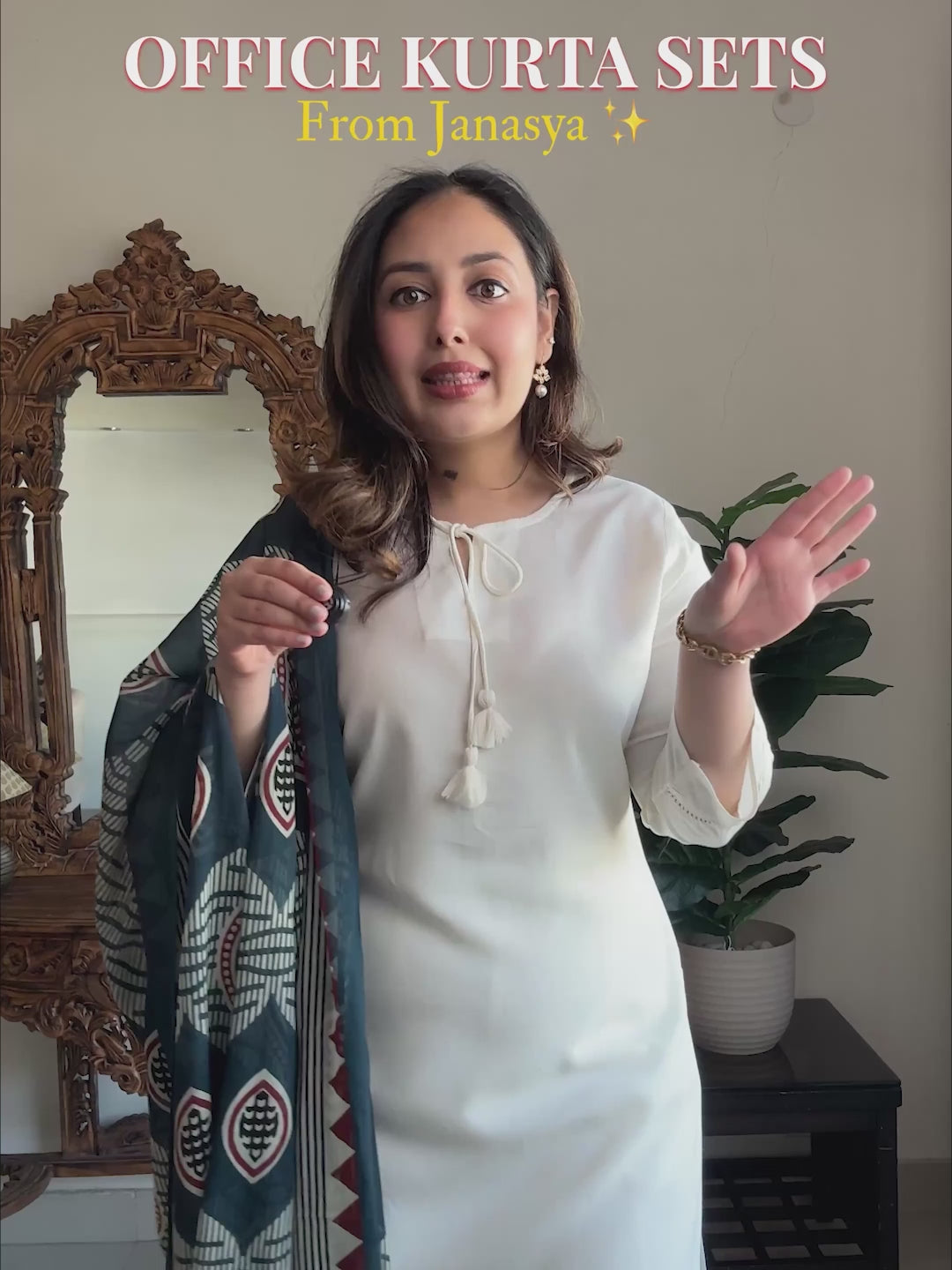 - Elevate your ethnic wardrobe with this off-white rayon suit set from janasya, designed for effortless elegance. The regular-fit kurta features a notch neckline with tie-up detailing and subtle lace accents on the sleeves for a refined touch. Paired with matching regular-fit pants, it offers a semi-elasticated waistband and a functional side pocket for comfort. The look is completed with a cotton printed dupatta, finished with tassels on all four sides. Pair with oxidised jhumkas and neutral-toned flats for a graceful daytime ensemble.