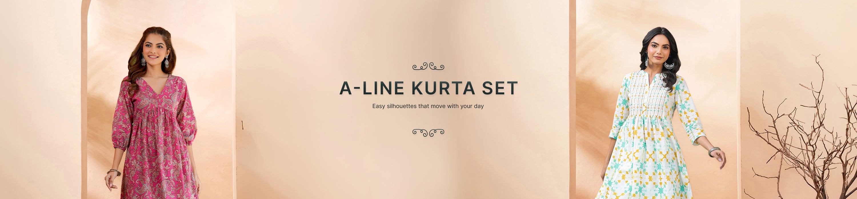 Janasya Women's Indigo Pure Cotton Floral Printed A-line Kurta Pant Set