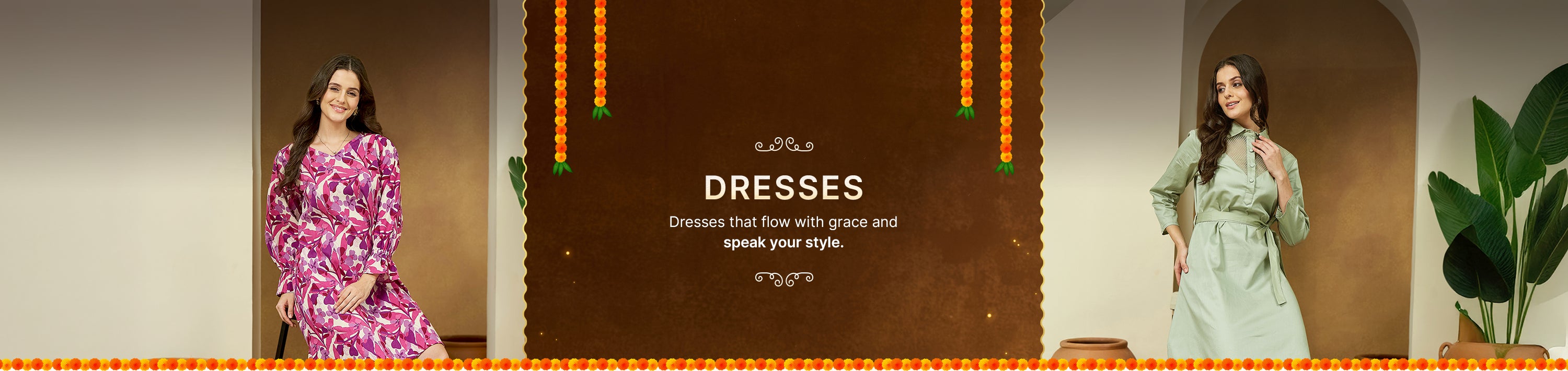 Explore our thoughtfully designed range of dresses for women under 1000 in A-Line, Flared. Find pocket friendly and budget friendly traditional fusion dresses from vivid colors, prints, and styles that blend in with the lively yet vibing to complex designs, prints, and bohemian-chic looks that combine traditional craftsmanship with the grace of women's fashion.