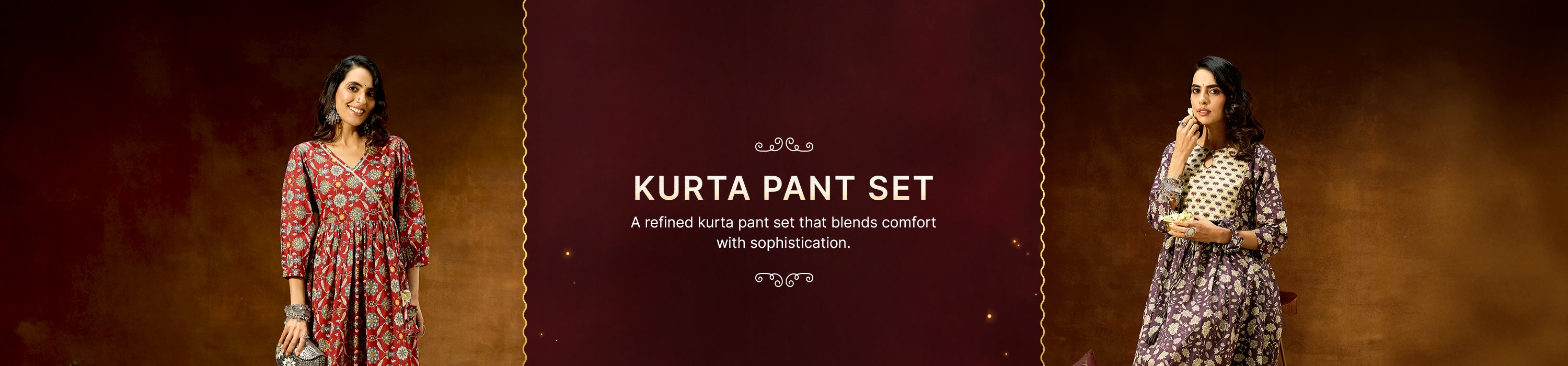 Janasya Women's Maroon Chanderi Silk Embellished Gold Printed Front Slit Kurta Pant Set