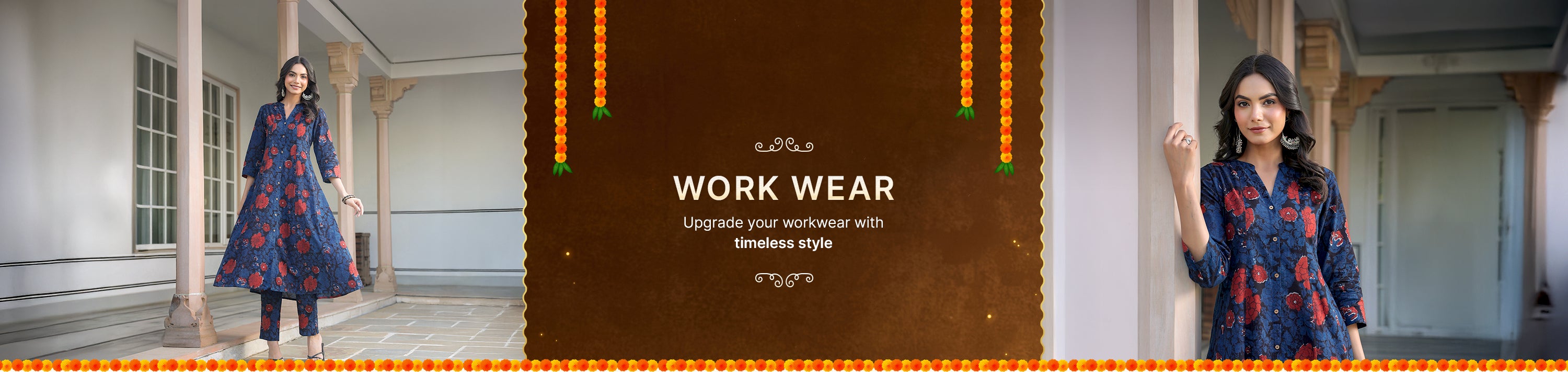 Janasya Women's Dark Blue Pure Cotton Floral Printed A-line Kurta Pant Set