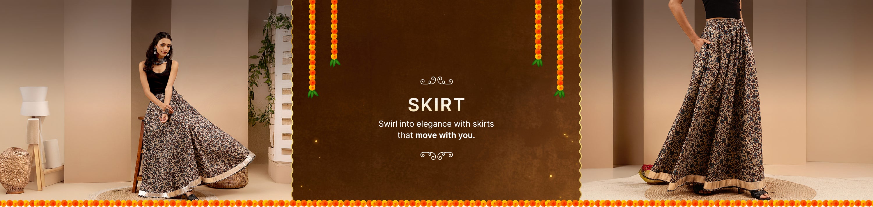 Janasya Women's Beige Pure Cotton Floral Printed Flared Skirt