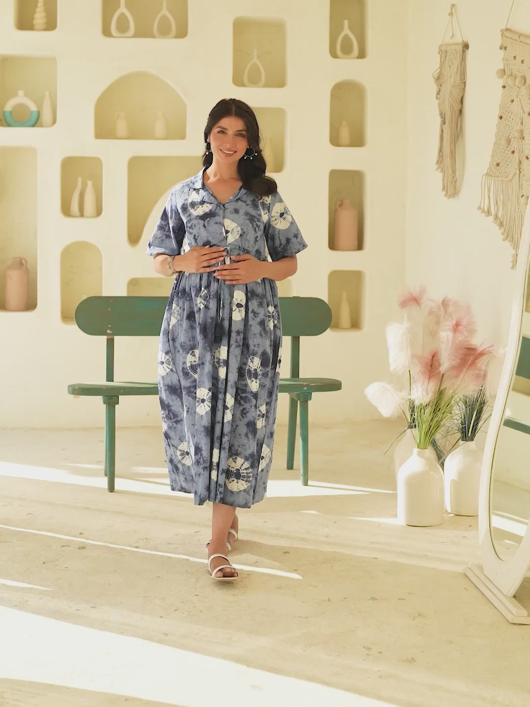 - Janasya’s maternity cotton tie-dye gathered dress blends comfort with effortless style. Designed with a zip at the front for easy feeding access, it features short sleeves and a smart shirt collar for a casual yet chic look. The drawstring waist tie-up allows for an adjustable fit, ensuring comfort throughout pregnancy. Perfect for moms-to-be who want both function and fashion.