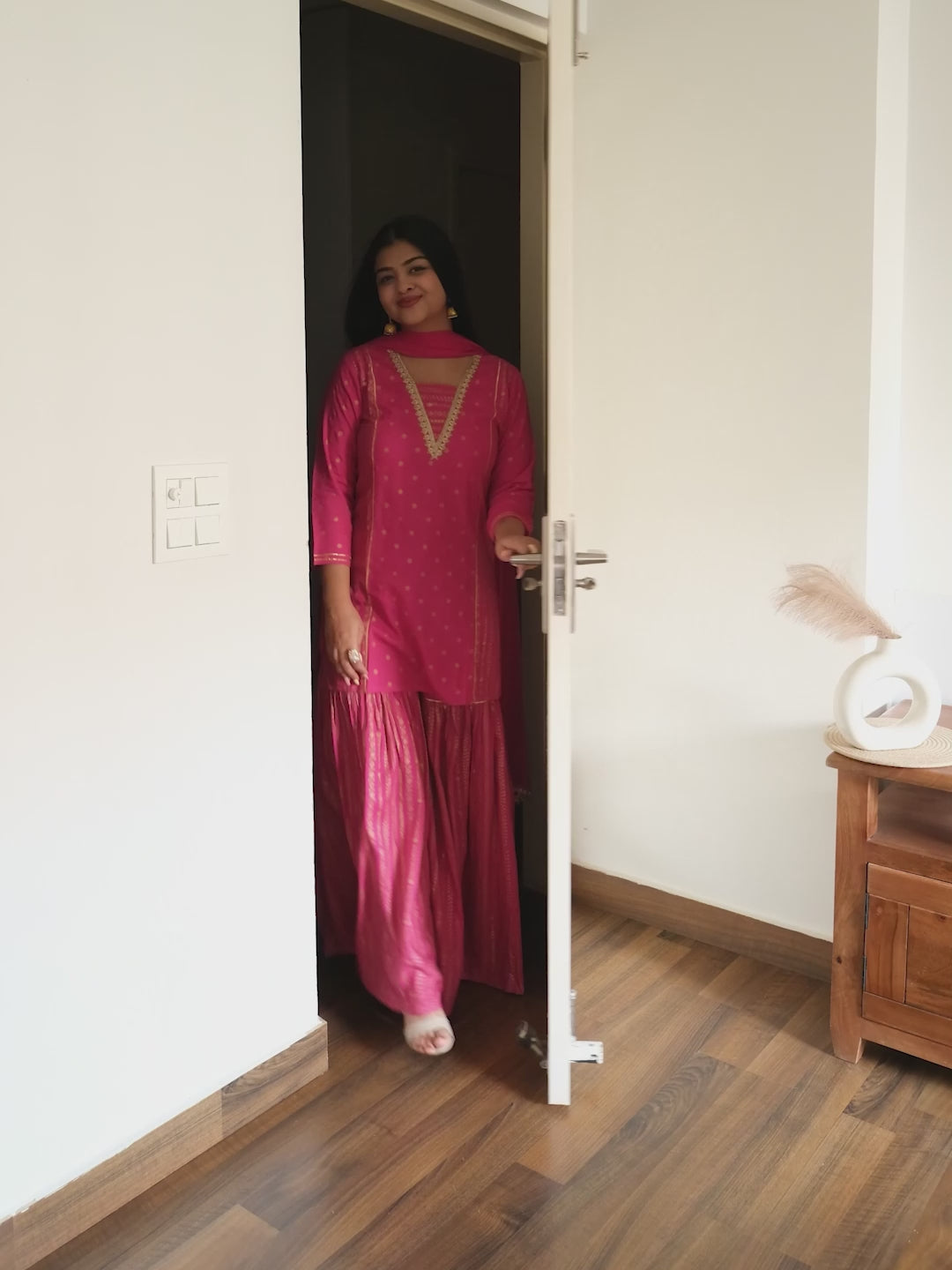 - Celebrate festive elegance with this vibrant pink sharara set from Janasya. Crafted in soft rayon, the kurta features a flattering v-neckline adorned with gota patti lace and gold foil prints. The three-quarter sleeves and side panels are detailed with lace and vertical foil motifs, adding charm and dimension. Falling just above the knee, the kurta pairs beautifully with a gathered sharara pant featuring gold foil work and gota patti lace at the knee. A drawstring ensures a comfortable fit. The look is completed with a solid pink chiffon dupatta with lace borders. Pair with gold-plated jhumkas and a statement ring.