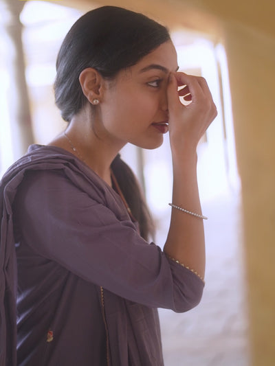 - This elegant purple cotton a-line kurta set features delicate sequin-embroidered motifs scattered across the fabric and a beautifully detailed v-neckline with intricate embroidery. Soft gathers under the yoke create a flattering silhouette, paired with a comfortable mull cotton lining for all-day ease. The set is completed with a solid mul narrow pant and a matching dupatta featuring gotta patti borders. Perfect for festive brunches, intimate gatherings, or just feeling special on an ordinary day.