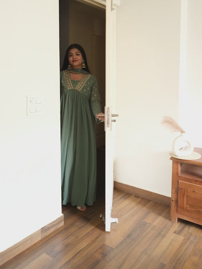 - Make a statement at any festive gathering with this stunning sage green a-line kurta and dupatta set from Janasya. Crafted in weightless georgette, the floor-length a-line silhouette features delicate gathers and butter crepe lining for a graceful flow. The yoke is adorned with intricate golden zari work and shimmering foil prints, adding a festive sparkle. Designed with a flattering v-neckline and full sleeves with button closure, it offers both comfort and sophistication. The outfit is paired with a matching chiffon sage green dupatta, adorned with golden foil prints and finished with an elegant gota patti border. Perfect for festive occasions, weddings, and celebrations, this ensemble blends timeless tradition with contemporary charm.