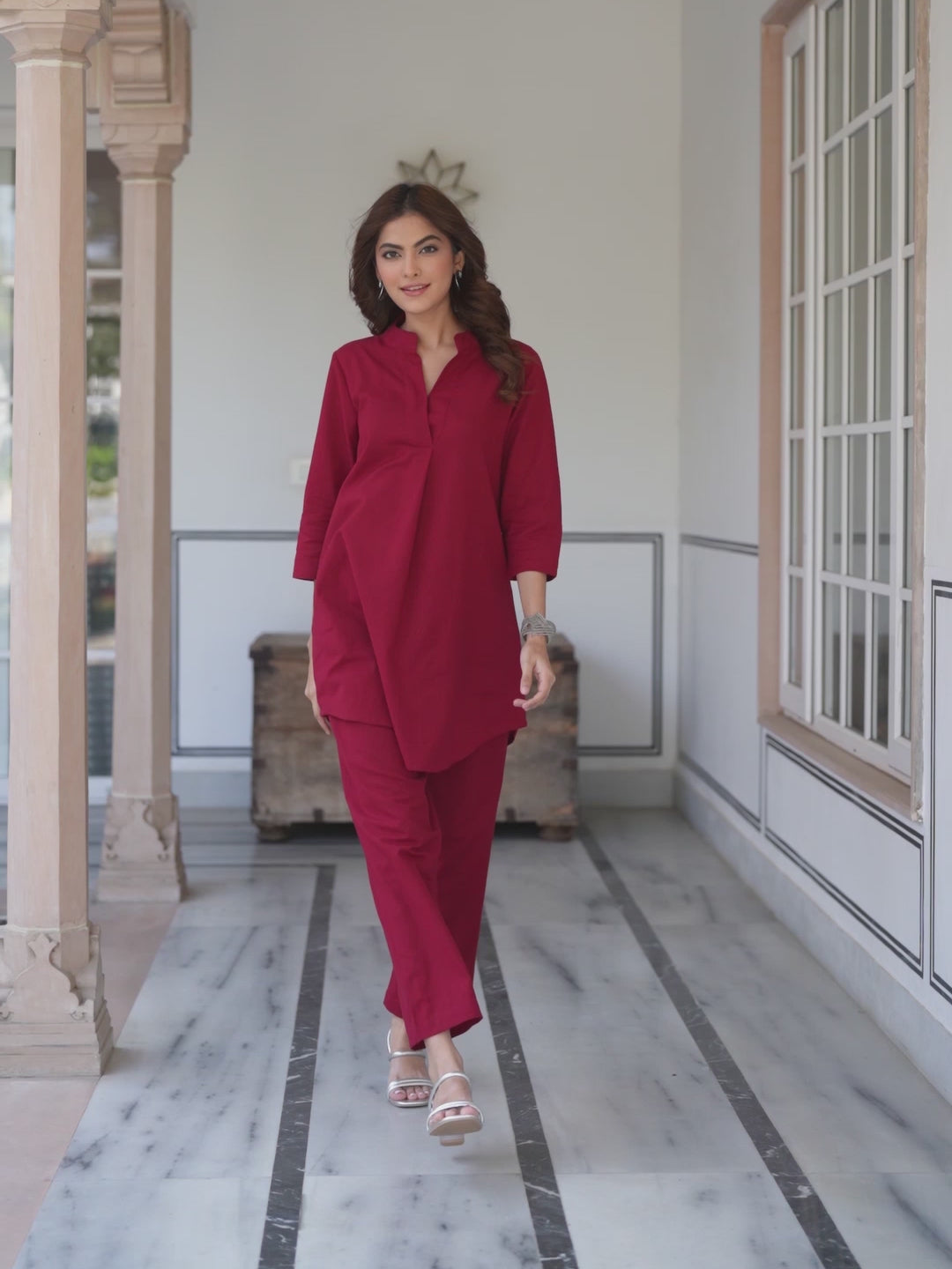- This maroon flex cotton straight co-ord set is the model of effortless style. The top features a sleek band collar with a v-neck and a single pleat under the yoke, offering a refined yet relaxed look. With a side pocket, this set combines simplicity with class. The matching straight pants complete the ensemble, making it perfect for casual outings. Versatile and comfortable, this co-ord set is a must-have addition to your wardrobe.