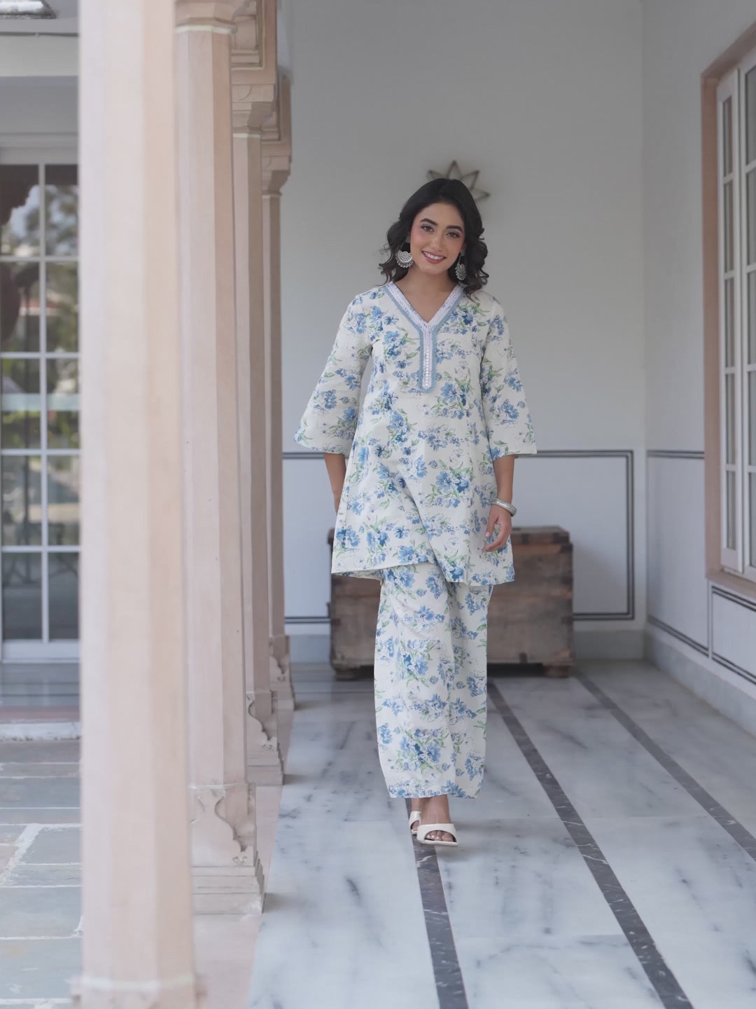 - Uplift your casual wardrobe with Janasya’s off white co-Ord set, the perfect blend of style and comfort. Crafted from flex cotton, this set features an A-line kurta with a charming floral print and a flattering V-neck lace and embroidery embellishments. Paired with matching straight pants with a side pocket, this ensemble is effortlessly chic. Complete the look with minimal accessories and enjoy the simple sophistication of this versatile outfit.
